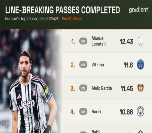 北京时间3月16日,根据数据机构Gradient的统计,尤文图斯队长洛卡特利本赛季在意甲平均每90分钟的穿透性传球次...