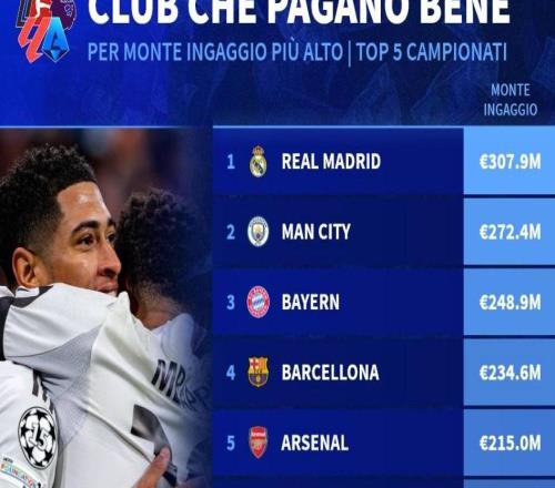 本赛季五大联赛球队工资TOP20:皇马超3亿欧第1,曼城第2