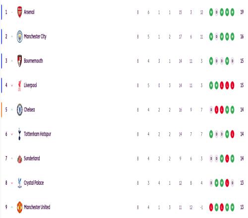 英超积分榜:阿森纳19分领跑,利物浦联赛三连败跌至第四