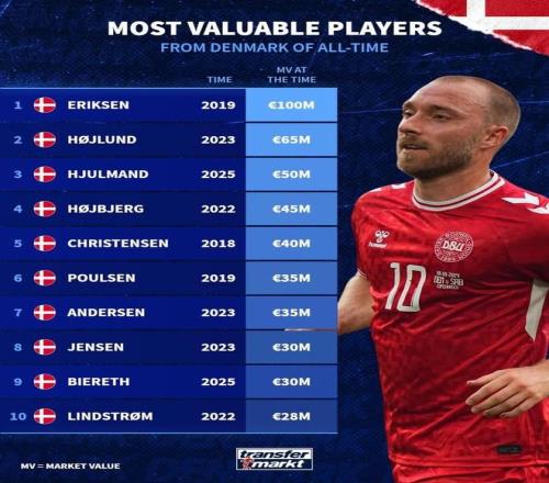 北京时间10月13日,德转统计出了丹麦球员历史身价榜,2019年身价曾经达到1亿欧元的埃里克森高居第一,霍伊伦排名第二,尤尔曼德第三,赫伊别尔与克里斯滕森也都榜上有名。