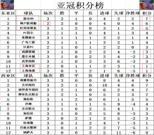 积分榜方面,东亚区,蔚山HD2胜1平暂时超过神户胜利船登顶,盯田泽维亚客场击败上海海港后1胜2平位列第3。墨尔本城昨晚赢球止住2连败,他们也就摆脱了垫底,和成都蓉城并列第8,3轮只拿到1分的中超冠军上海海港成了新的副班长。西亚区,利雅得新月3战全胜领跑,吉达国民,迪拜青年国民,阿布扎比联合2胜1平紧随其后。