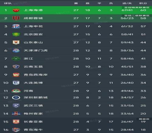 中超最新积分榜