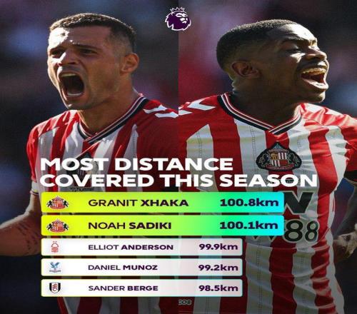 雷速体育10月29报道 本赛季英超前9轮比赛已全部战罢,英超官方于今天列出了一份赛季至今球员跑动距离的排名榜单。在这份榜单中只有扎卡与萨迪基两位球员的跑动距离超过了100km,而他们正好都来自黑猫桑德兰。目前桑德兰位列英超第4,黑猫回到英超的第一赛季便取得如此令人惊喜的成绩,这与球员不惜体力的跑动所带来的活力息息相关。