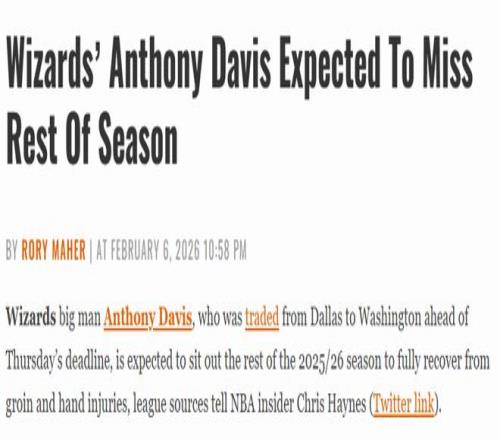 北京时间2月7日,据联盟消息人士向NBA知名记者Haynes透露,交易截止日前从独行侠被交易奇才的内线球星安东尼-戴维斯,预计将缺席2025-26赛季剩余所有比赛,以便让腹股沟和手部的伤势彻底痊愈。