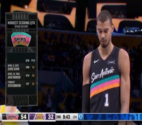 二,文班亚马单节25分,创造马刺队史play-by-play时代单节得分纪录。