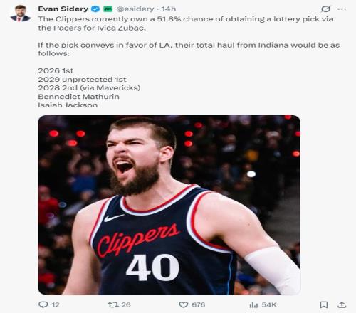 根据《福布斯体育》记者埃文-斯迪瑞的报道,步行者这个2026年首轮签有51.8%的概率是乐透签,换言之步行者为了得到祖巴茨牺牲了1个乐透签、2029年不保护首轮(是否乐透还未知)但这足以扎心洛杉矶湖人队。