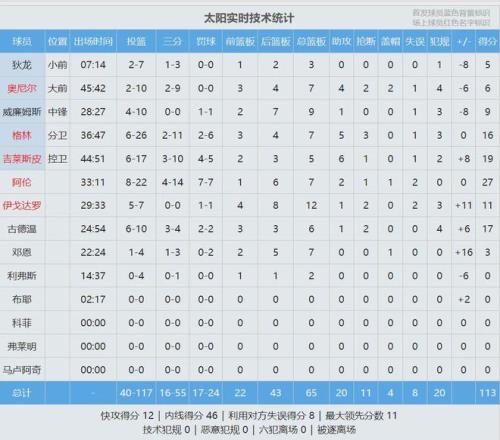 此役太阳投篮命中率34.2%,三分命中率29.1%,罚球命中率70.8%,真实命中率44.3%。本赛季NBA所有获胜球队当中,太阳本场投篮和真实命中率都是最低的。此役过后,太阳33胜24负仍居西部第七,领先第八勇士3.5个胜场。