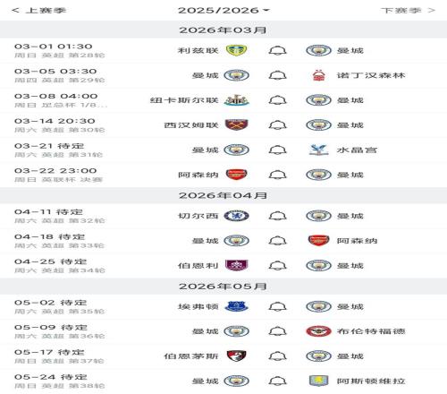 曼城剩余英超赛程