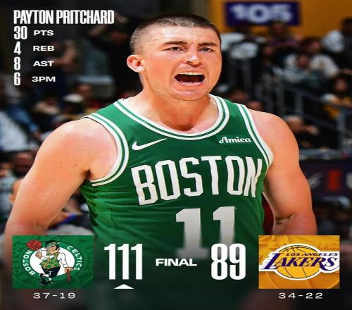 凯尔特人客场111-89血洗湖人!普里查德38分钟轰30分8助,三分9中6,这效率比你抢到限量球鞋还上头。对普里查德来说,这已是生涯第10次30+,其中5次在本赛季——上赛季最佳第六人,年薪才670万,现在直接起飞!赛季初对骑士狂砍42分,这场对湖人又30分,三分6中6,罚球4中4,简直把湖人防得怀疑人生。