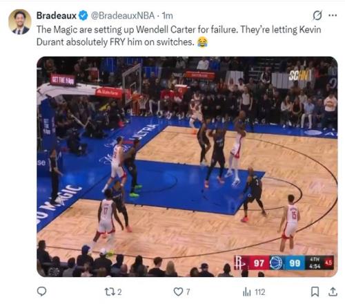 终场前4分54秒贝恩再度帮助魔术反超,杜兰特又单点小卡特,杜兰特后仰中投再中两队继续扳平。随后杜兰特持球开始吸引包夹,这说明魔术已经不认为小卡特能单防住杜兰特了,这让杜兰特妙传篮下的申京轻松上篮。