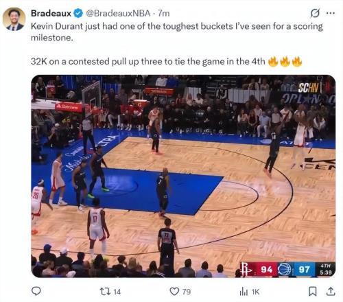 这场比赛末节的杜兰特就是死神一般的存在,尤其是终场前5分38秒,两队的僵持阶段,依靠杜兰特的关键三分球帮助球队扳平,这个三分球也让他完成32000分里程碑。