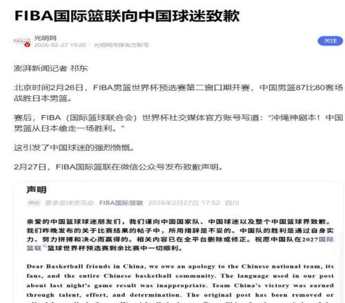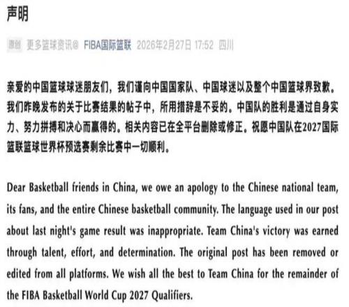 面对潮水般的口诛笔伐,2026年2月27日,国际篮联被迫发布了官方致歉信,正式承认文案措辞极不妥当,并向中国篮协及广大球迷致以歉意