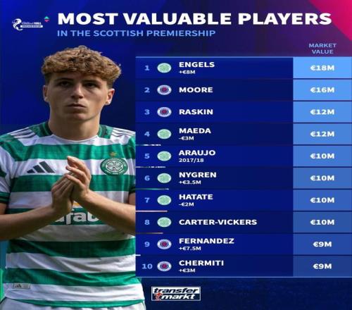 北京时间3月5日,在更新了苏格兰超级联赛球员的身价之后,德转统计出了此次更新苏超身价最高的10名球员,凯尔特人的比利时中场恩格斯上涨800万欧元,目前以1800万欧元排名第一,热刺外租格拉斯哥流浪者的小将米凯伊-穆尔1600万欧元第二,两位日本球员前田大然和旗手怜央上榜。