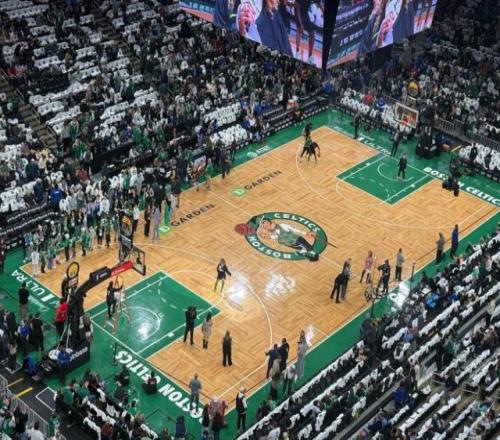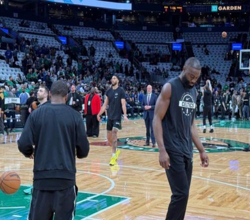 时隔近十个月从跟腱伤势中迎来复出的塔图姆,在开场前一个半小时便早早出场热身。当双探花再次同框热身时,凯尔特人仿佛又回到了那支“东部之王”的无解姿态。为了迎接当家球星的归来,TD花园球馆全场铺满了三叶草T恤,距离开赛还有一个小时,球馆内就已经人声鼎沸。