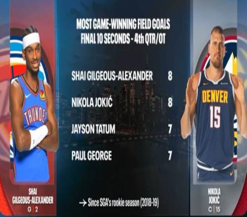 除此之外,自SGA进入联盟后,在终场前10秒内完成准绝杀/绝杀次数最多的球员是约基奇、SGA,这两人都是8次,所以关键球能力约基奇也不输亚历山大。