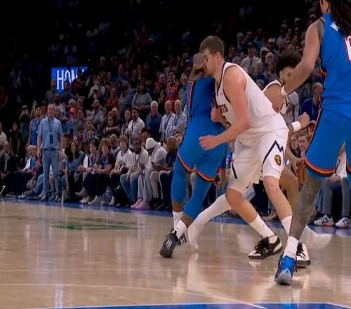 比赛还剩1分12秒,雷霆领先7分,悬念看似结束,但实则这比赛真正精彩的部分才刚刚开始。多尔特在一次挤掩护的时候,左手出现在了不应该出现的位置,直接打到约基奇的面门,裁判回看之后吹了一次恶意犯规,掘金两罚一掷。
