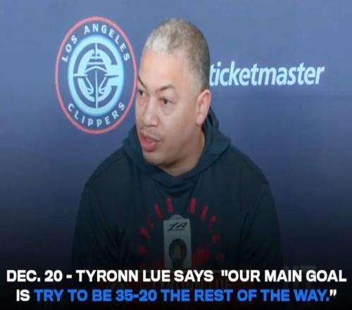 时间回到去年12月,快船对阵湖人的第二次交手之前,泰伦卢在接受采访时表示,快船要在接下来的比赛里取得35胜20负,从而将胜率提升到50%。