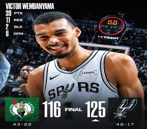 需要说的是,文班亚马的39分里有36分来自后三节,他在下半场拿了24分,第四节中间段的三分+扣篮+三分非常关键。