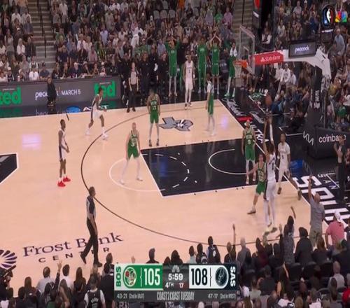 ——剩下41秒前,还是与文班亚马挡拆,强突凯尔特人三人防线,上篮打进,还造成犯规(加罚没进),这一球可以说杀死了比赛