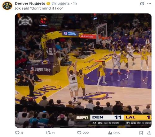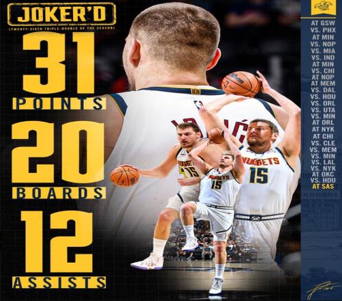 北京时间3月15日,掘金以125-127惜败湖人。此役约基奇罕见的暴扣了,而且他拿到了本赛季第27次三双,也是职业生涯第191次三双,下半场也是依靠约基奇的发挥抹平17分的差距,末节被里夫斯神奇拖入加时赛,而加时赛约基奇被艾顿打爆,最终东契奇准绝杀。